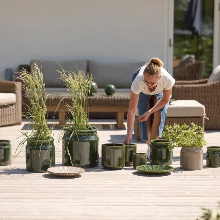 Krukkene er utstyrt med dreneringshull i bunnen, noe som gjør dem ideelle for utendørsbruk og sikrer optimal drenering for plantene dine. Med sin robuste utførelse og tidløse design passer disse krukkene like godt på en balkong som i en større hage.