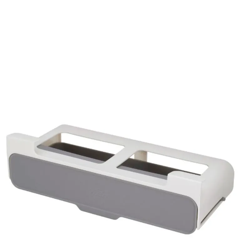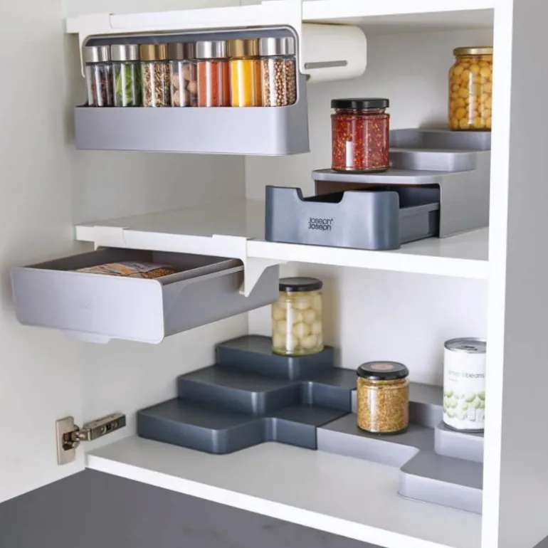 Krydderhylle fra Joseph Josephs CupboardStore. En får aldri nok skapplass. Denne intelligente løsningen benytter skapplassen under hyllene. Den har et smart, uttrekkbart rom som har plass til inntil syv standard krydderkrukker. Den er enkel å installere med sterke 3M tape. Passer for kjøkkenenheter over 32 cm bredde. Laget av PP plast. Rengjøres med fuktig klut.