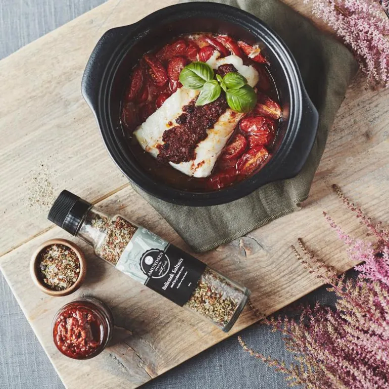 Ingredienser: Salt, rød paprika, sukker, løkgranulater, svart pepper, grønn paprika, hvitløkgranulat, tomaltgranulat, rosmarin, basilikum, persille, sitronsyre E330, rapsolje