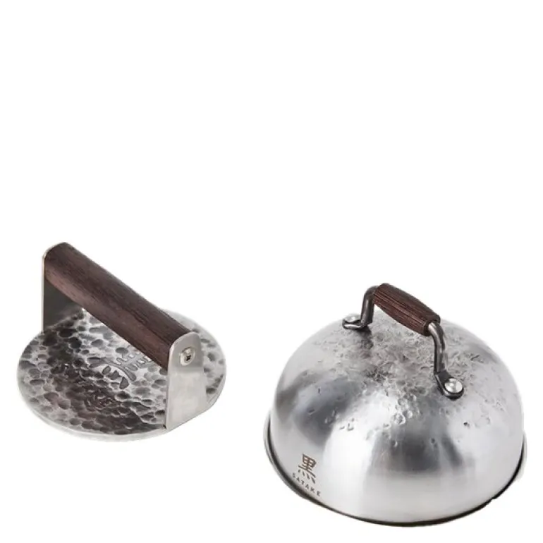 Satake Kuro 2-dels Smash Set er det ultimate verktøyet for burgerentusiaster som ønsker å løfte smaken til et nytt nivå. Settet inneholder en solid burgerpresse og en ost-cloche, begge laget av håndbanket stål med et rått og karakteristisk design. Stålet gir et robust og kraftfullt uttrykk, mens trehåndtaket på pressen gir et behagelig grep som gjør det enkelt å jobbe med kjøttet.