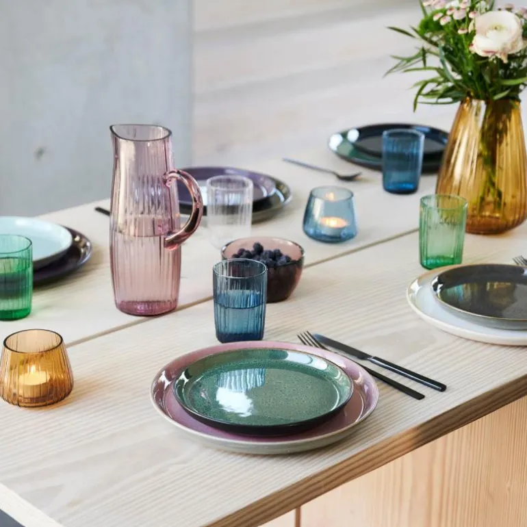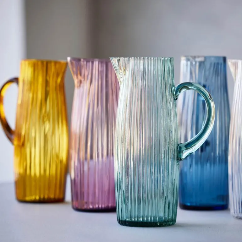Nyt synet av den fine kannen i riflet, gjennomfarget glass når du heller opp vann eller juice. Kannen fås i fargene grønn, rav, rosa og blå, og når du kjøper fra Kusintha-kolleksjonen, støtter du samtidig barn i nød i verdens fattigste områder.