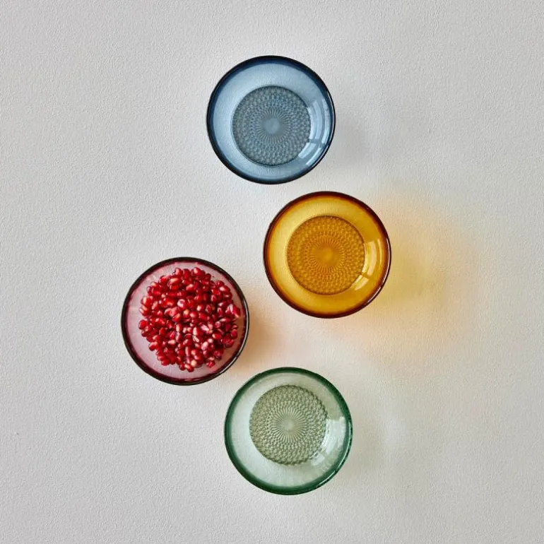 Flotte skåler i gjennomfarget glass med den perfekte størrelsen til alt, for eksempel snacks, frokost og kaker. De fås i fargene grønn, rav, rosa og blå, og når du kjøper fra Kusintha-kolleksjonen, støtter du samtidig barn i nød i verdens fattigste områder. Kan vaskes i oppvaskmaskin.