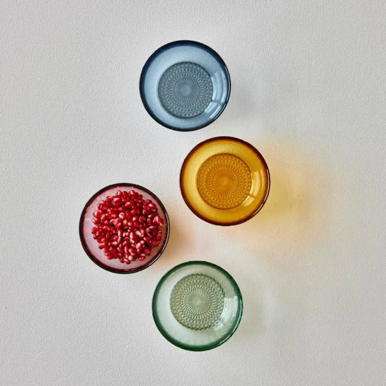 Flotte skåler i gjennomfarget glass med den perfekte størrelsen til alt, for eksempel snacks, frokost og kaker. De fås i fargene grønn, rav, rosa og blå, og når du kjøper fra Kusintha-kolleksjonen, støtter du samtidig barn i nød i verdens fattigste områder. Kan vaskes i oppvaskmaskin.