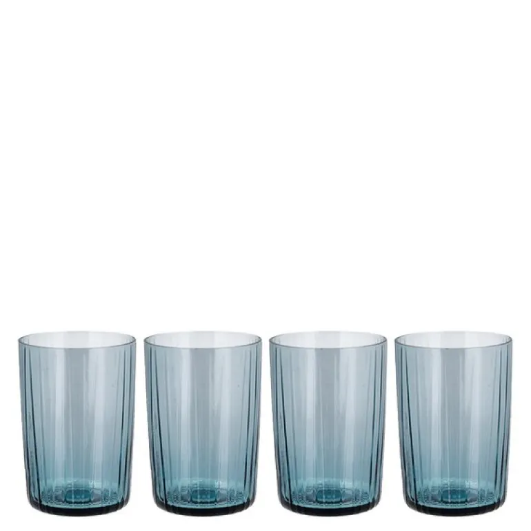 Kusintha vannglass 28 cl 4 stk blå, fra Bitz. De elegante vannglassene i gjennomfarget glass er designet med den samme delikate, riflede stilen som vannflaskene i Kusintha-serien. Disse glassene er tilgjengelige i en rekke vakre farger, inkludert grønn, rav, rosa, blå og en helt gjennomsiktig variant. Enten du dekker bordet til hverdags eller fest, vil disse vannglassene tilføre et snev av sofistikert stil og farge til enhver anledning.