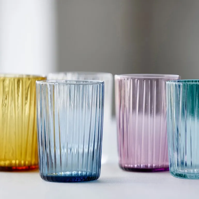 De elegante vannglassene i gjennomfarget glass er designet med den samme delikate, riflede stilen som vannflaskene i Kusintha-serien. Disse glassene er tilgjengelige i en rekke vakre farger, inkludert grønn, rav, rosa, blå og en helt gjennomsiktig variant. Enten du dekker bordet til hverdags eller fest, vil disse vannglassene tilføre et snev av sofistikert stil og farge til enhver anledning.