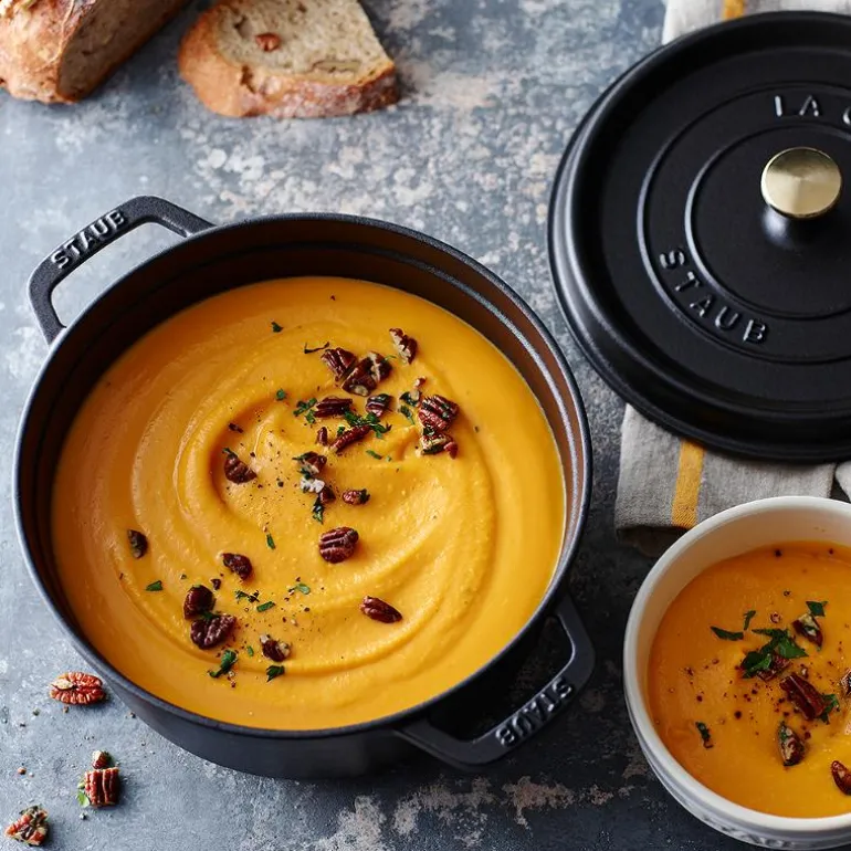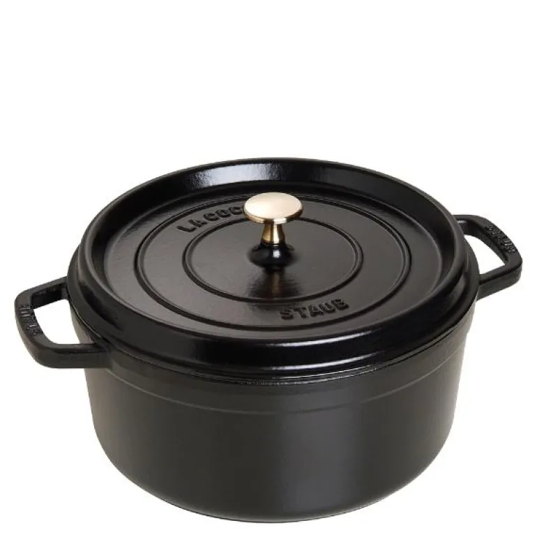 Emaljert gryte i støpejern laget i Frankrike, av Staub. Dette er et ekte håndverk. Fargen er svart med en elegant matt finish, som sammen med knotten i messing, gir gryten et eksklusivt preg. Emaljen er meget slitesterk og motstandsdyktig mot riper. Gryten