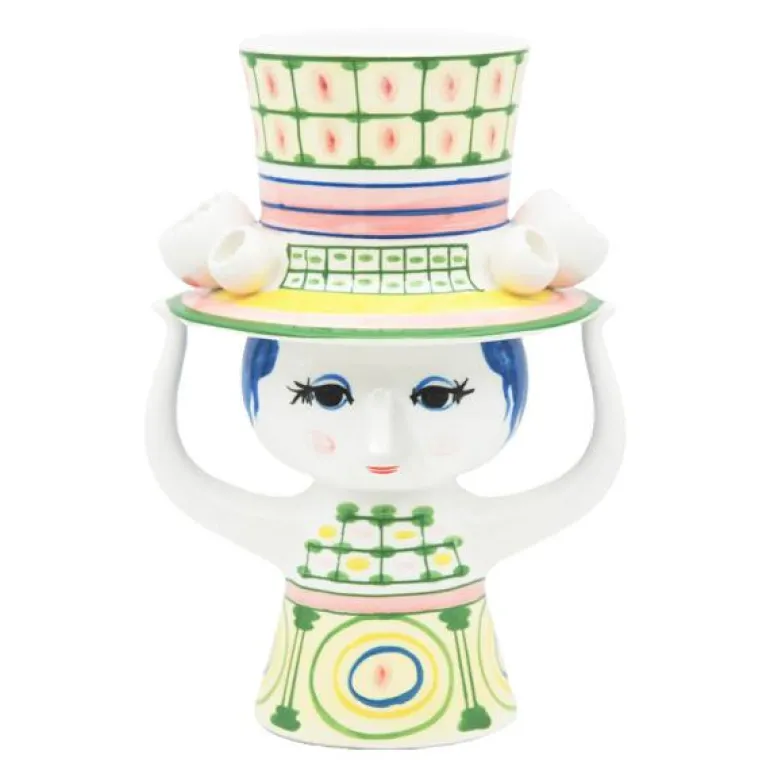 Vasen i blankglasert keramikk på 24,5 cm er preget av den grønne fargen, og skjørtets geometriske sirkler står i flott kontrast til hattens ruter. Som et lite tårn vokser hatten opp mot himmelen, mens den fine damen balanserer hatten med hendene sine. Det gir vasen et finurlig og fantasifullt uttrykk, perfekt til blomsterbuketten i den lekne boliginnredningen. En annen detalj som går igjen i serien, er de små, figurative blomstene som er plassert langs skyggen på hattene. Enda en dekorativ detalj inspirert av Bjørn Wiinblads originale former og farger. Akkurat som Bjørn Wiinblad representerer Lady with hat alt som er tullete, skjevt, kreativt og vidunderlig.