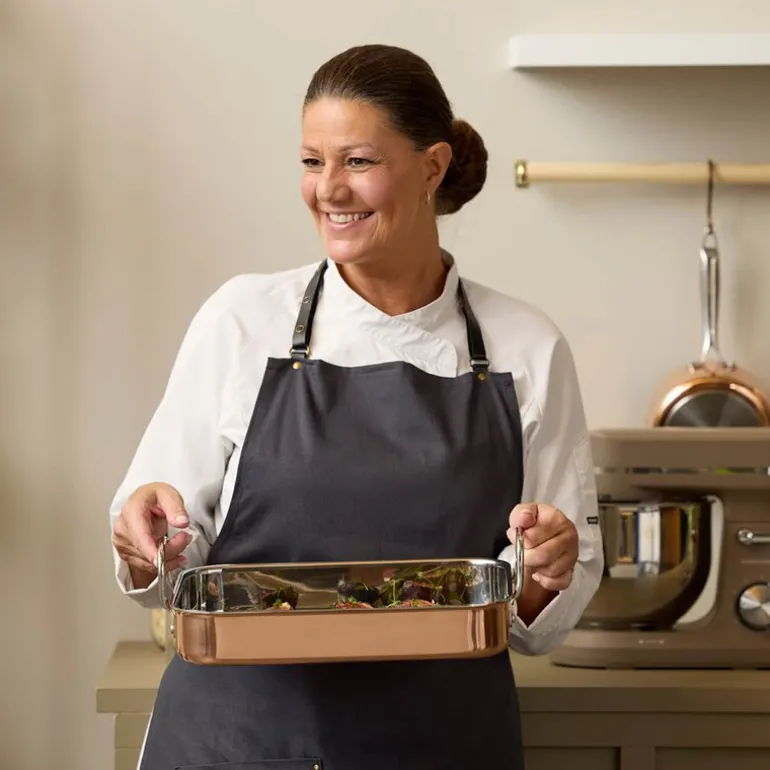 For å bevare den skinnende utsiden anbefales det å bruke kobberpuss jevnlig. Kobber utvikler over tid en naturlig patina hvis det ikke poleres, men det er enkelt å gjenvinne glansen ved å pusse overflaten dersom du foretrekker en blank finish. Om kobberet blir oransjegult, skyldes det ofte luftfuktighet – en enkel puss gjør at pannen ser ut som ny igjen.