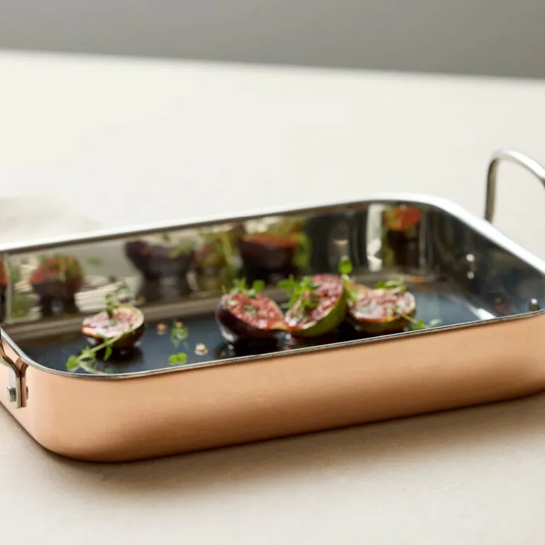 Langpanne kobber fra Blomsterbergs, med målene 35×25,5×6,3 cm, er en praktisk og elegant løsning for baking og matlaging. Den er laget av kobber og rustfritt stål, med solide håndtak som gir godt grep. Pannen tåler stekeovn opptil 220 °C og bør vaskes for hånd med varmt vann, mild såpe og en myk børste.