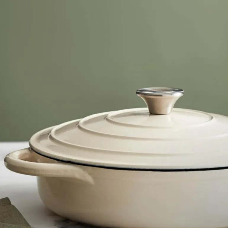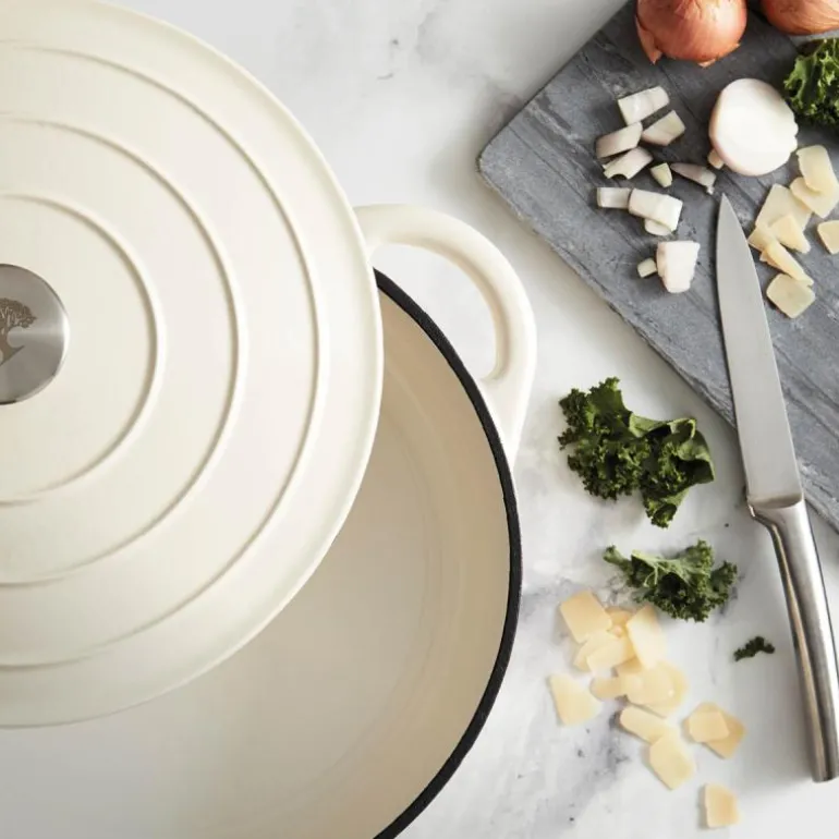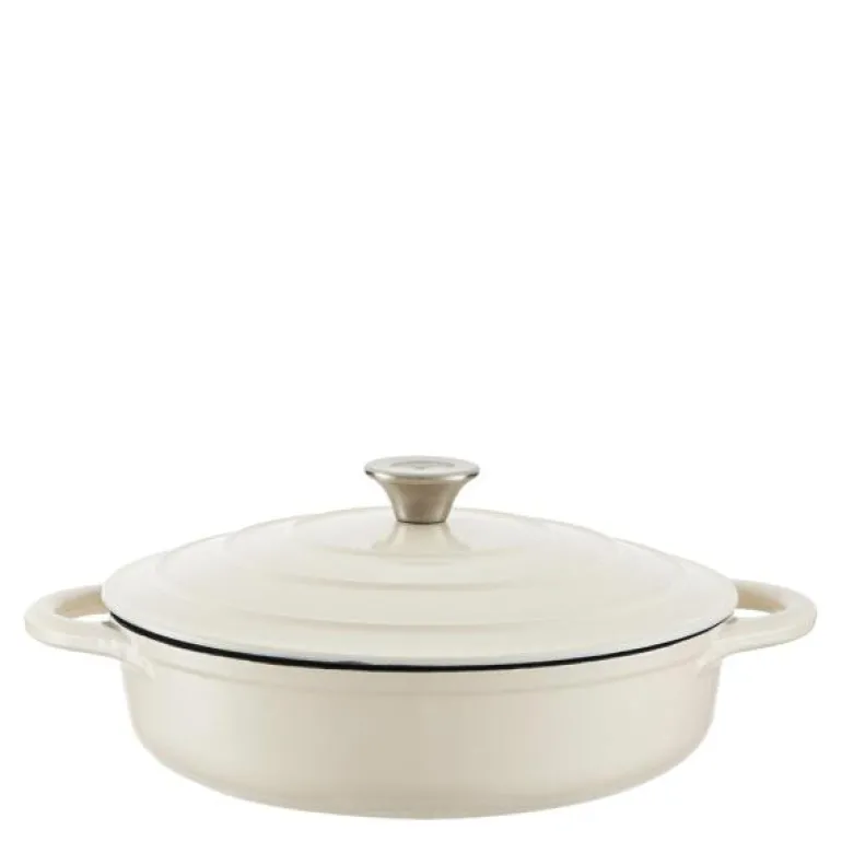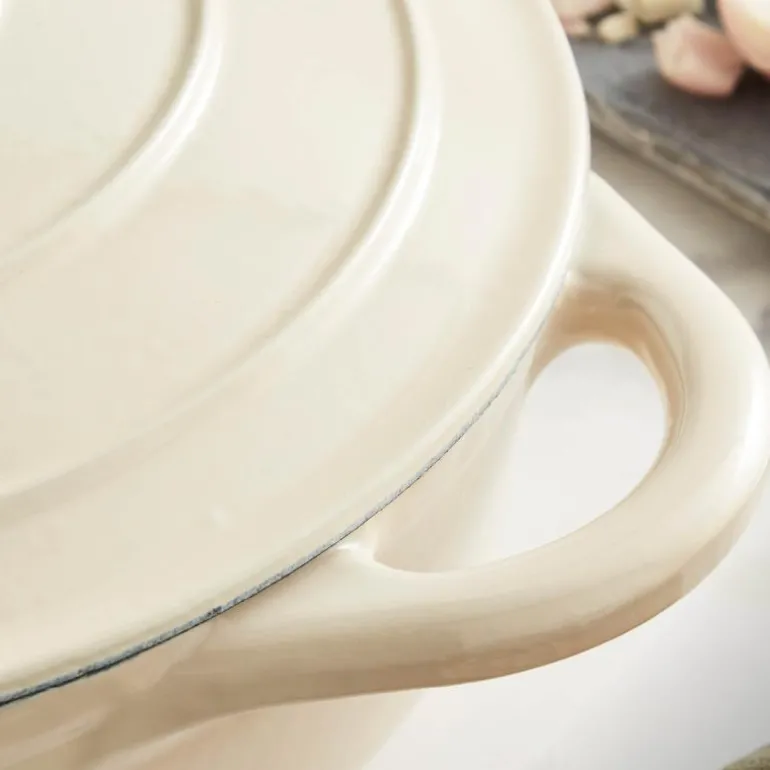 Lav støpejernsgryte på 28 cm med et volum på 2,5 liter fra Barbary & Oak. Laget av støpejern av høy kvalitet og emaljert i en vakker kremhvit farge, er denne gryten både holdbar og stilfull.