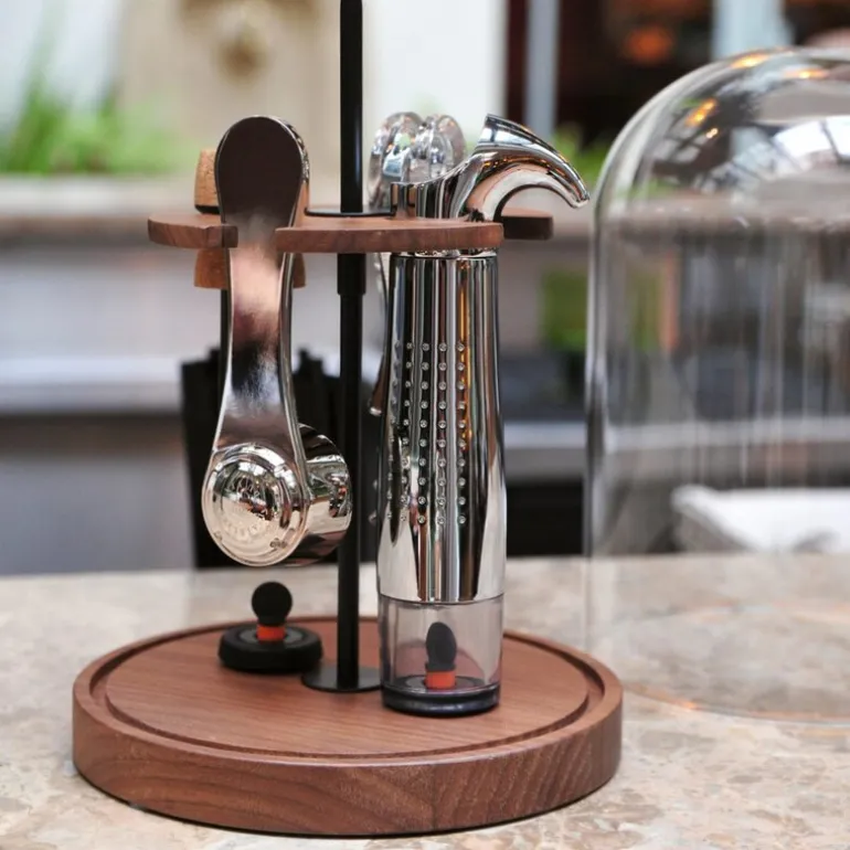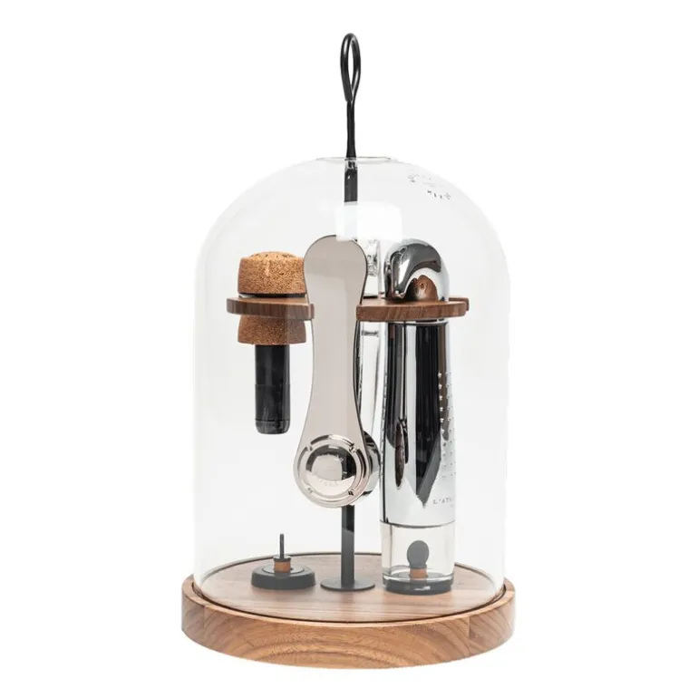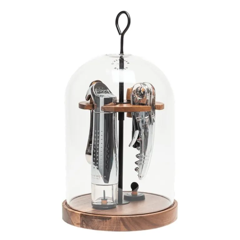 L’Atelier du Vins Le Globe vintilbehør gir deg de viktigste verktøyene for vinservering i en stilfull glassbolle plassert på et trefat. Dette håndlagde settet inneholder en metallvakuumpumpe Gard’Vin®, en Soft Machine® krystallkorketrekker, en champagnekorkåpner, to PÅ/AV-vinstoppere og en boblestopper for champagne. Praktisk og lett å flytte rundt på, kan dette settet enkelt tas med til forskjellige rom eller terrassen, og tilfører eleganse til enhver vinservering.