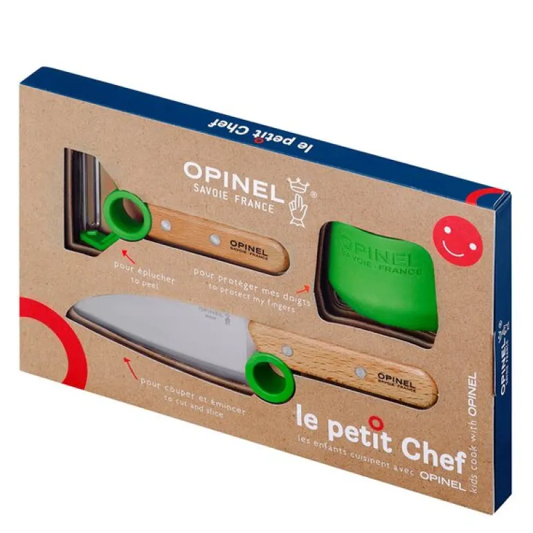 Le Petit Chef knivsett fra Opinel gjør matlaging til en trygg og lærerik opplevelse for barna. Med et ergonomisk design og treningsring får barnet hjelp til å plassere fingrene riktig, noe som gir god mestringsfølelse og bedre kontroll under kutting.