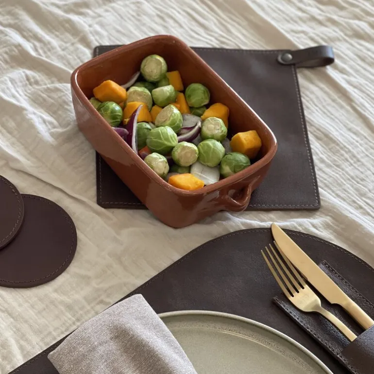 Leather gryteklut fra Crafted er et luksuriøst og funksjonelt tilbehør til kjøkkenet, designet for å tåle høye temperaturer og samtidig være en stilig detalj. Den måler 21 x 21 cm og er håndlaget i Nederland av høykvalitets kuskinn. Med to lag skinn gir denne grytekluten ekstra beskyttelse mot varme, noe som gjør den ideell for håndtering av varme panner og gryter.