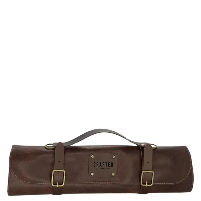 Leather knivveske 41 cm brun fra Crafted er en eksklusiv knivmappe håndlaget i Nederland av 100% kuskinn, designet for å oppbevare opptil 7 kniver i ulike størrelser. Med lommer i varierende størrelser, er denne knivvesken ideell for både profesjonelle kokker og matentusiaster som ønsker en elegant og funksjonell løsning for oppbevaring av sine kniver.