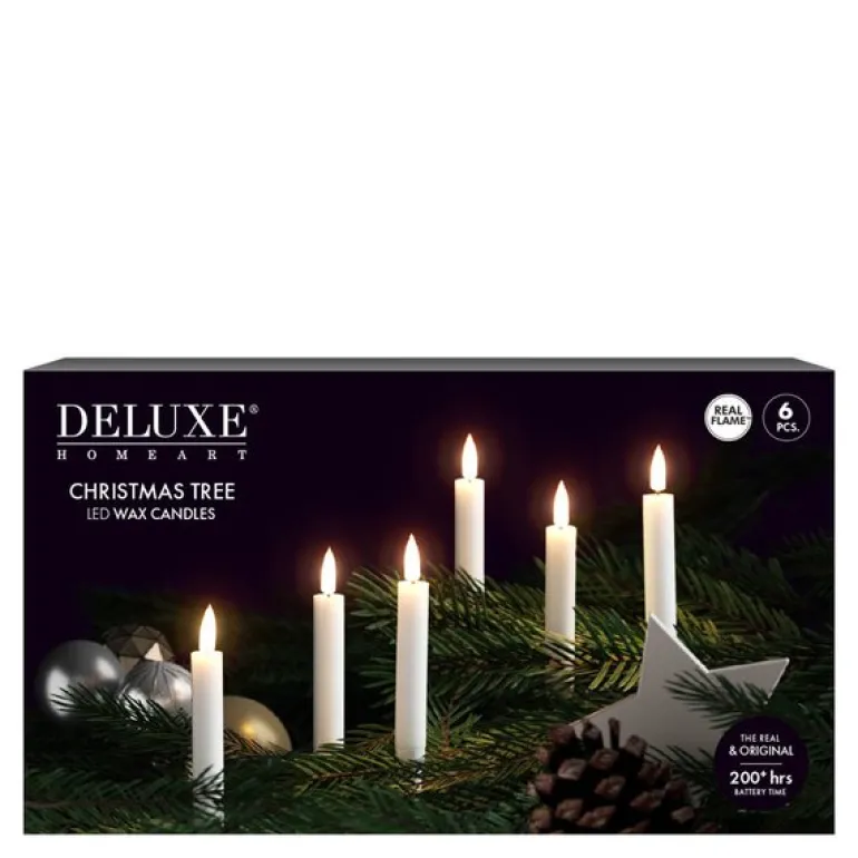 LED juletrelys 1,2 x 13 cm i klassisk hvit fra Deluxe Homeart gir treet ditt et elegant preg med trygg og vakker belysning. De smale lysene med realistisk 3D-flamme og voksbelegg ser ut som ekte stearinlys – uten åpen flamme.