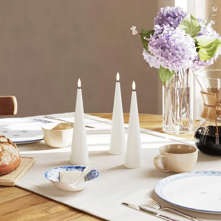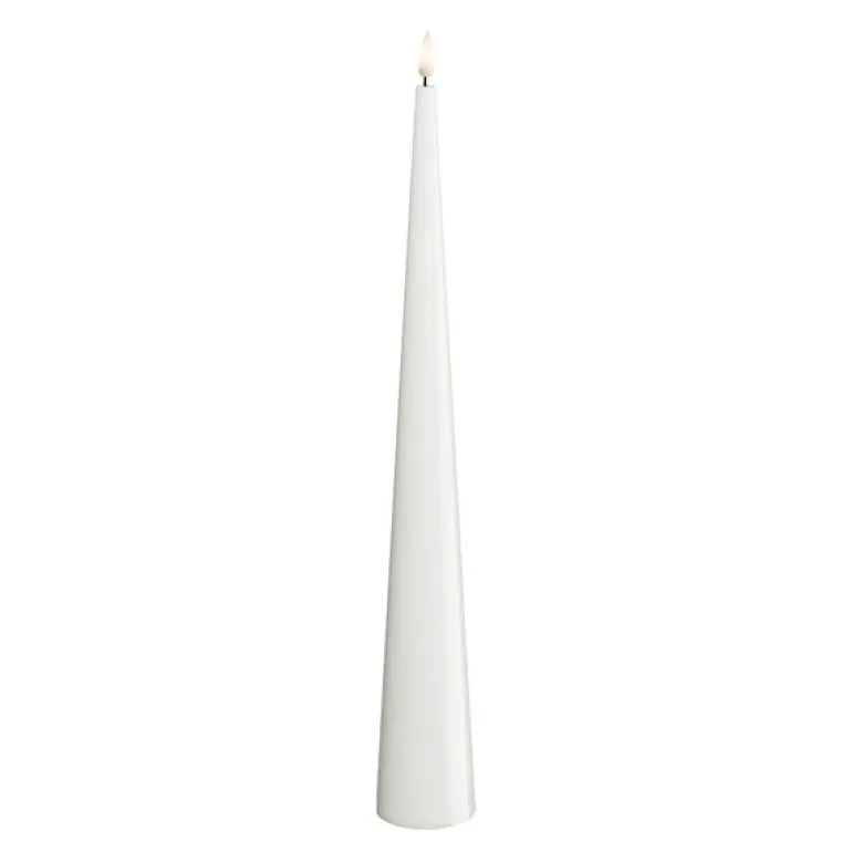 LED kjeglelys 5 x 38 cm i hvit, lakkert finish fra Deluxe Homeart er et elegant innslag i enhver borddekking eller interiørstil. Den smale kjegleformen kombinert med en blank overflate og realistisk 3D-flamme gir et sofistikert og tidløst uttrykk – helt uten brannfare.