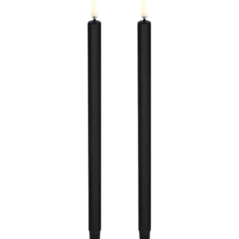 LED-kronelys fra Uyuni Lighting i elegant svart design gir en stilfull og trygg løsning for å skape stemning i hjemmet. Denne 2-pakningen med 25 cm høye lys har den patenterte 3D-flammen som gir en naturtro flimreeffekt uten fysisk bevegelse. Lysene drives av 2 AAAA-batterier (ikke inkludert) og har en imponerende brenntid på opptil 150 timer.