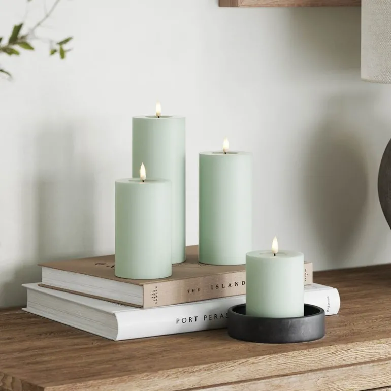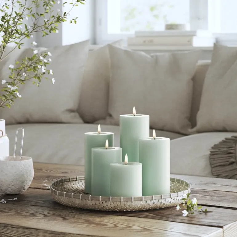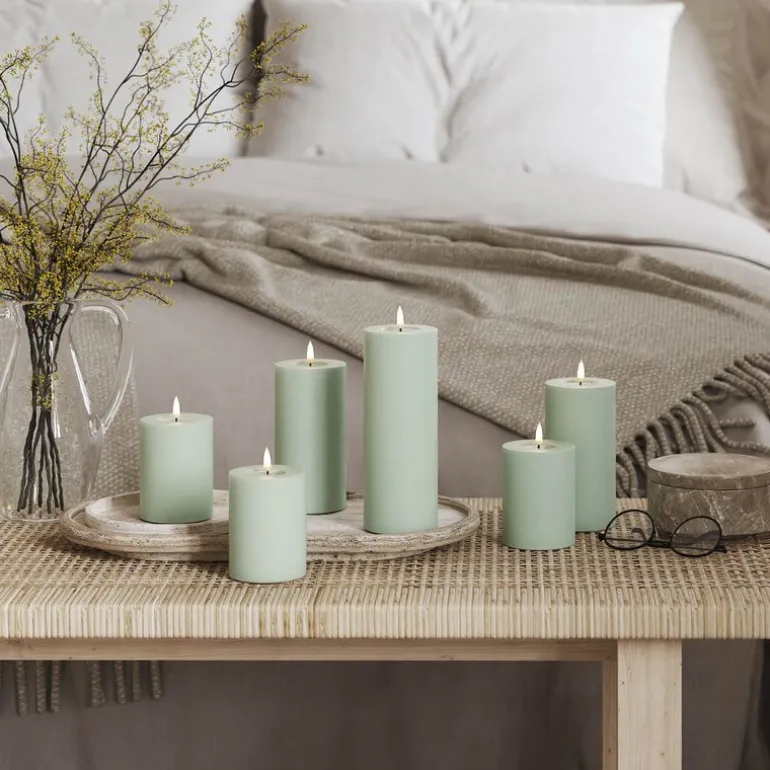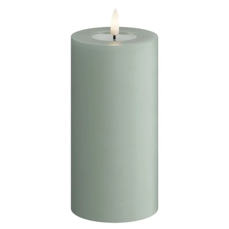 LED kubbelys 7,5 x 15 cm i salviegrønn fra Deluxe Homeart skaper en elegant og lun stemning i hjemmet. Den dempede grønntonen gir et moderne uttrykk, mens den patenterte 3D-flammen og det realistiske voksbelegget gir følelsen av et ekte stearinlys – uten brannfare.