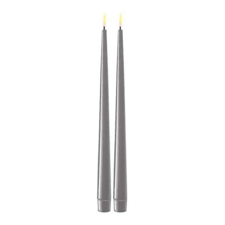 LED shiny dinner candle fra Deluxe Homeart, kommer i en pakke med 2 stk 28 cm høye lys i fargen grå. Deluxe Homeart har designet Real Flame – noe som gir en naturtro 3D-flamme. Shiny dinner candles er laget av 100% ekte stearin – veldig vakre og naturtro. Tenk på inneklima, miljø og brannfare! Om du vil unngå giftige partikler og sot fra vanlige stearin lys, så er disse LED-lysene et flott alternativ.