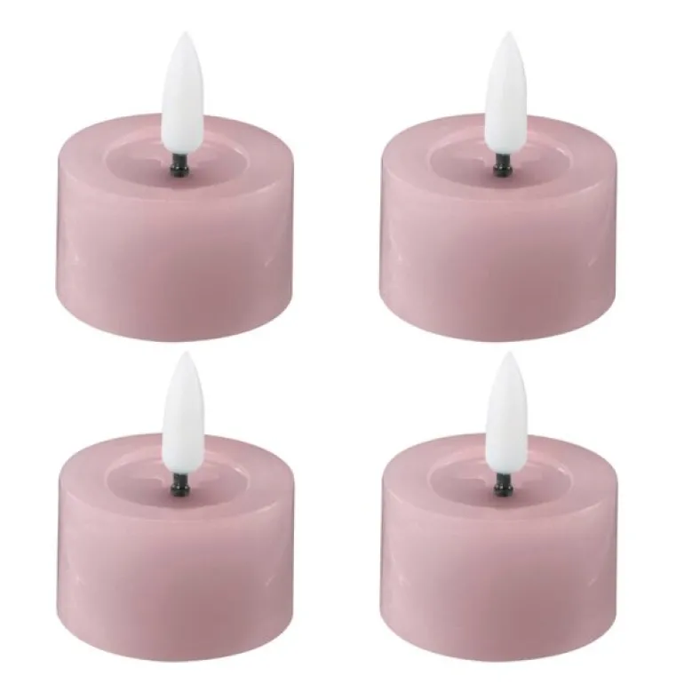 LED telysene fra Edelweiss leveres i en pakke med fire stk, hver i pastel rose-farge og med målene 4,5 x 2,5 cm. De har en vokset overflate, smeltet kant og en flakkende flamme som gir en realistisk effekt uten brannrisiko.