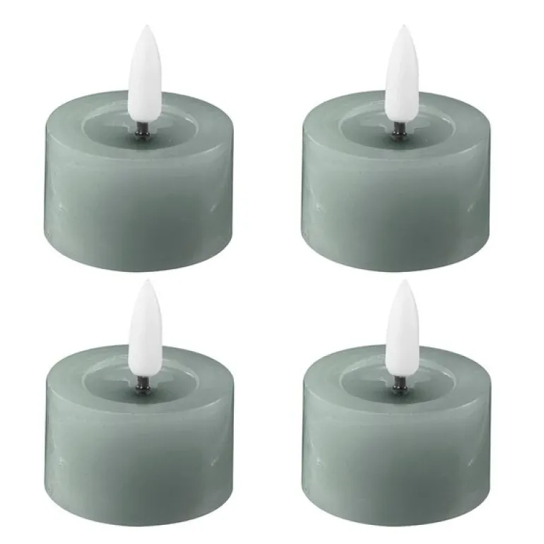 LED telysene fra Edelweiss leveres i en pakke med fire stk, hver i sage-farge og med målene 4,5 x 2,5 cm. De har en vokset overflate, smeltet kant og en flakkende flamme som gir en realistisk effekt uten brannrisiko.
