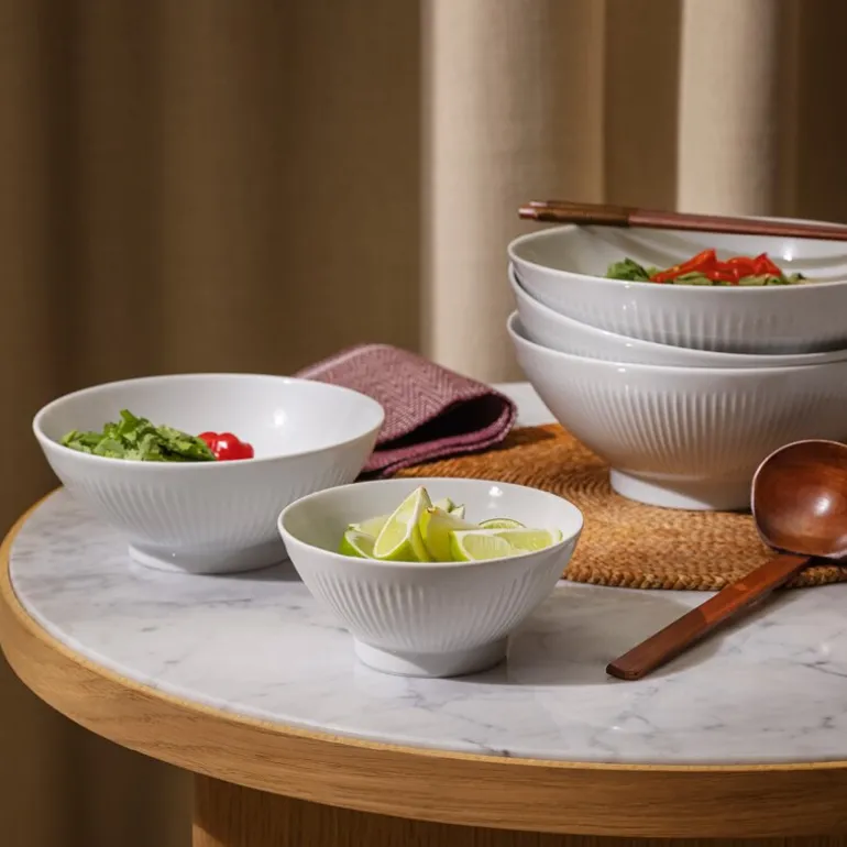 Med sin allsidige design er skålen også perfekt til retter som poke bowls, supper og pasta. Fremstilt i hvitt porselen av høyeste kvalitet og dekorert med de elegante rillene fra Legio Nova-serien, tilfører skålen en tidløs eleganse til bordet.