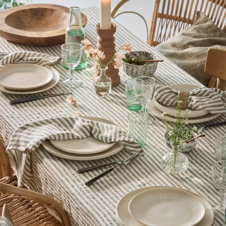 Denne duken passer like godt til hverdags som til festlige anledninger. De klassiske stripene og den naturlige linstrukturen gir et tidløst og balansert uttrykk som enkelt lar seg kombinere med andre tekstiler og servise.