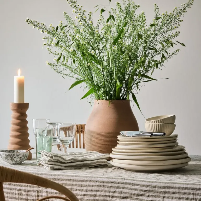Leon-serien inkluderer også servietter, kjøkkenhåndklær og duker i ulike størrelser, noe som gjør det enkelt å skape en helhetlig stil rundt spisebordet.