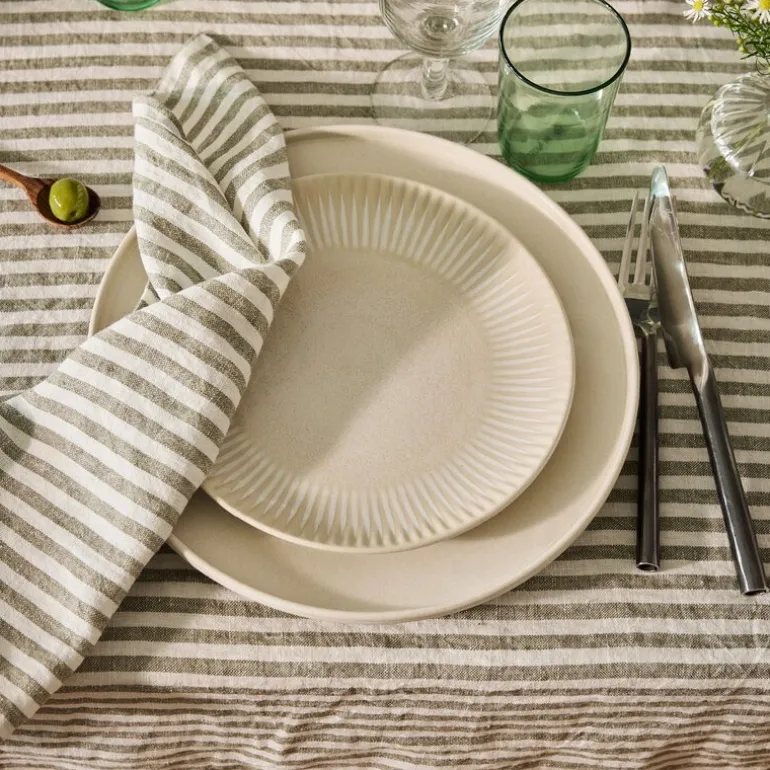 Leon duk fra Tell Me More er en håndvevd duk i 100 % europeisk lin med et stripet mønster i fargen seagrass. Duken måler 145×145 cm og har en dekorativ vevkant som gir et gjennomført og håndverksmessig uttrykk. Linet har en grov struktur og er farget for hånd før det soltørkes, noe som gir stoffet levende og varierte nyanser.