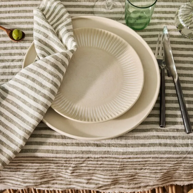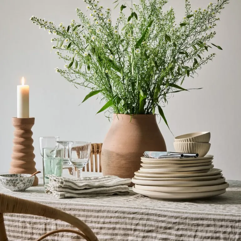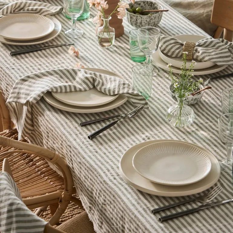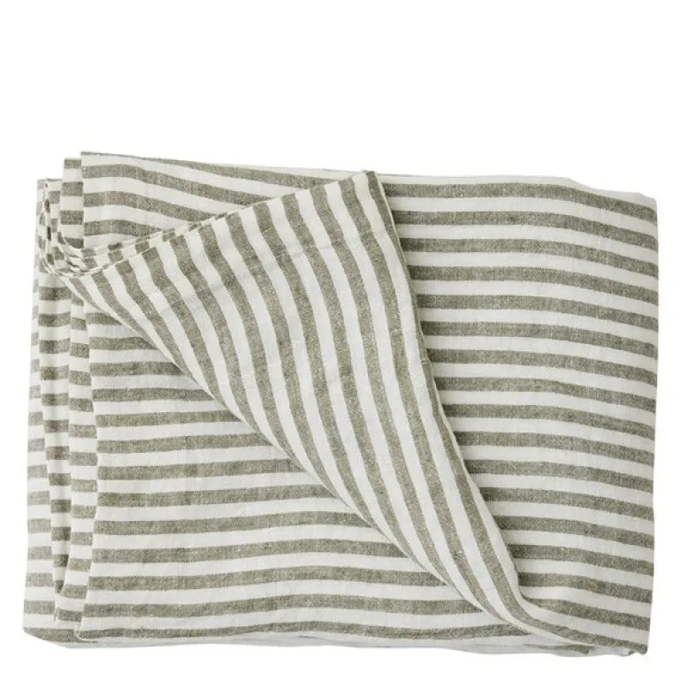 Leon duk fra Tell Me More er en håndvevd duk i 100 % europeisk lin, laget med en tydelig struktur og klassiske striper i fargen seagrass. Duken måler 175×175 cm og har en dekorativ vevkant som gir et gjennomført og håndverksmessig uttrykk.