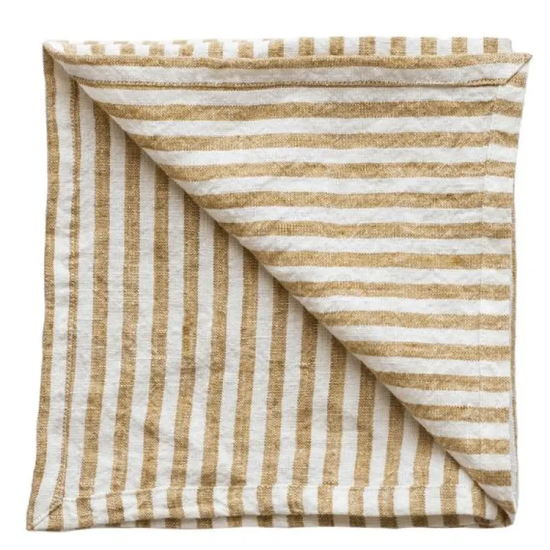 Vakker håndvevd serviett i 100% lin. Vår stripete serviett Leon er i en grovere linkvalitet og har en vakker tekstur som gir et tidløst inntrykk og vil overleve sesong etter sesong. Lin har god sugeevne, tørker raskt, er slitesterk og varer over tid og egner seg derfor utmerket til serviett. Å legge til tekstiler rundt spisebordet gir en koselig og innbydende følelse. I tekstilserien Leon finnes også kjøkkenhåndklær og duker i samme vakre farge og mønster.