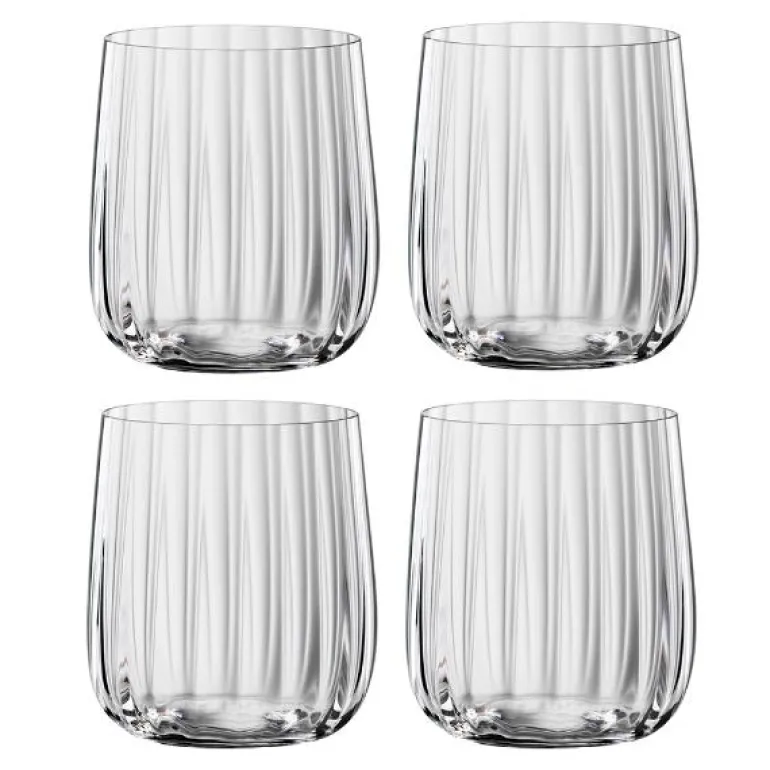 Sett med 4 whiskyglass fra den tyske produsenten Spiegelau; en del av Riedel-gruppen. Glassene som fungerer like bra til whisky som vann. Glassene er i Lifestyle-serien og har en myk bølgestruktur i glasset. Lifestyle er en serie som kombinerer det moderne med zeitgeist og garanterer servering med stil. Whiskyglassene fra Spiegelau rommer 340 ml og er 90 mm høye.