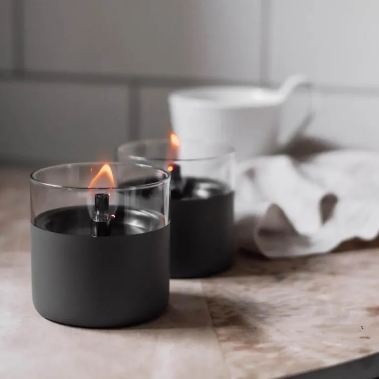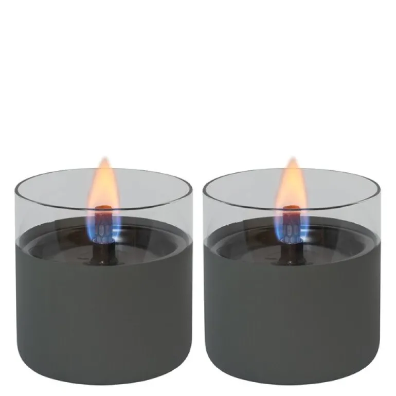 Gavesett bestående av 2 stk bordlykter Lilly 8 cm i fargen grå, fra TenderFlame. Skap den gode stemningen med dette settet bordlykter, som gir deg koseflamme uten røyk, sot eller lukt. Livlige og dansende flammer i glasskuppelen. Bordlyktene passer like godt inne som ute.
