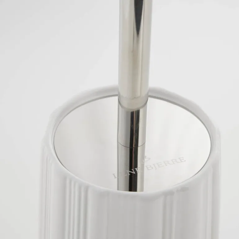 Lily toalettbørste i hvit fra Lene Bjerre har et sofistikert design som tilfører et eksklusivt preg til baderommet. Med sin vakre hvite nyanse og elegante stripemønster er den både et praktisk og dekorativt element i interiøret. Toalettbørsten er laget av keramikk og måler 11,5 x 11,5 x 39 cm.