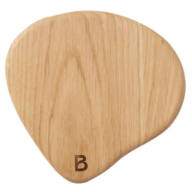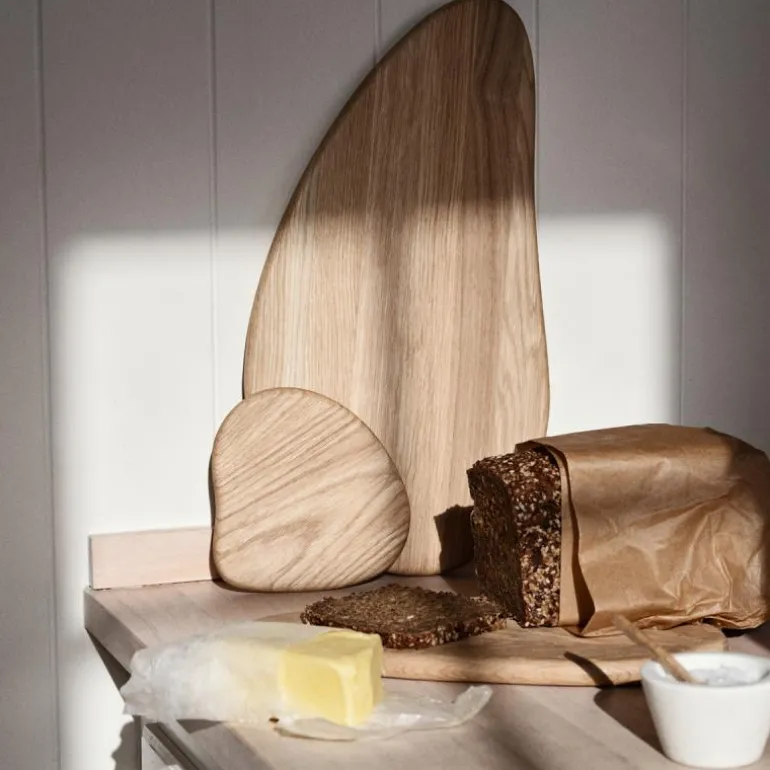 Den organsisk formede Limfjord fjølen i naturfarget oliert massiv eik er både praktisk og dekorativ, både på kjøkkenbordet, langs veggen på kjøkkenbenken, og på det dekkede bord.