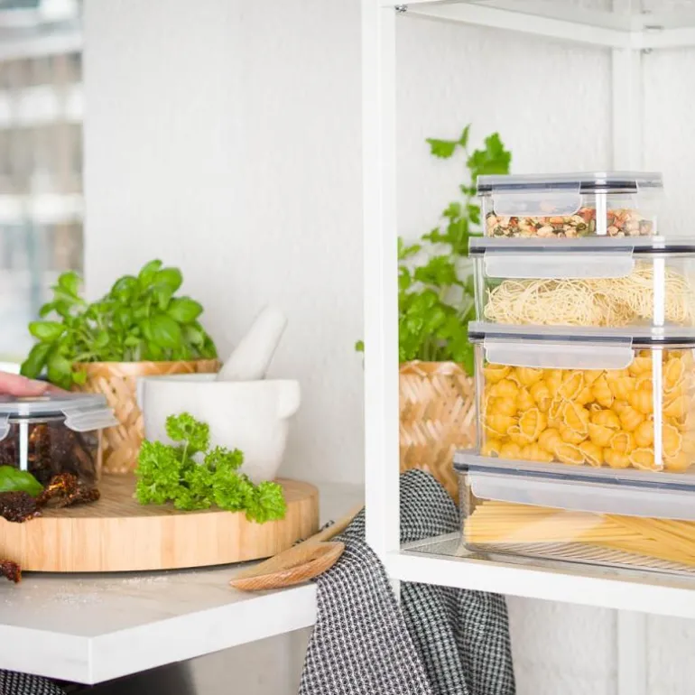 Produsert i Tritan® plast som har et glassklart utseendet. Lokk i PP plast med silikonkant for lufttett lukking som bevarer smak og ferskhet i råvarene.