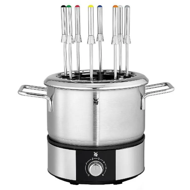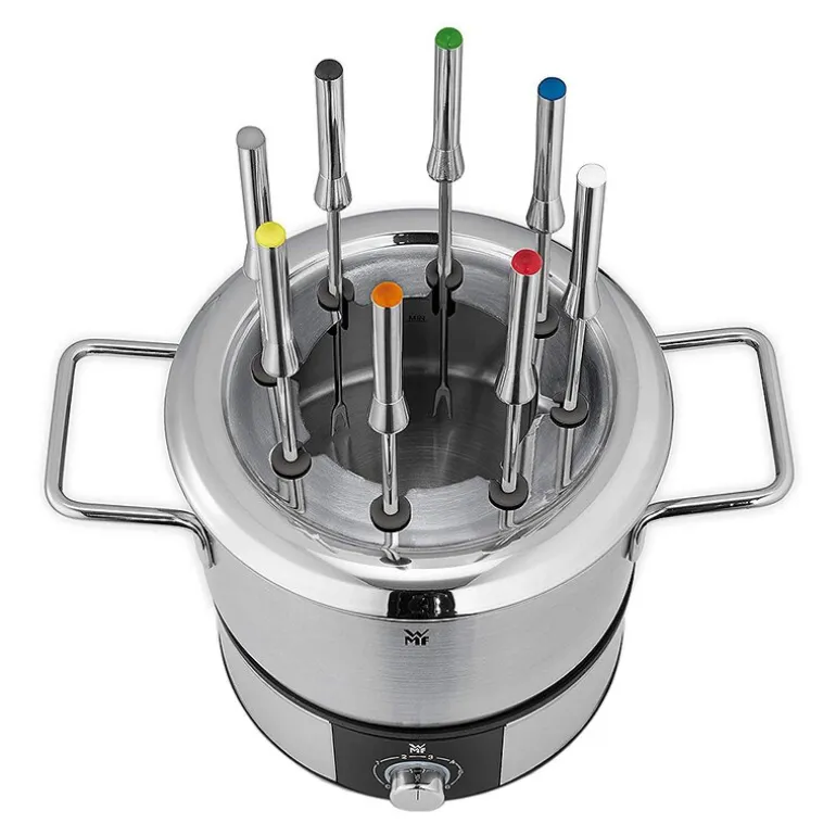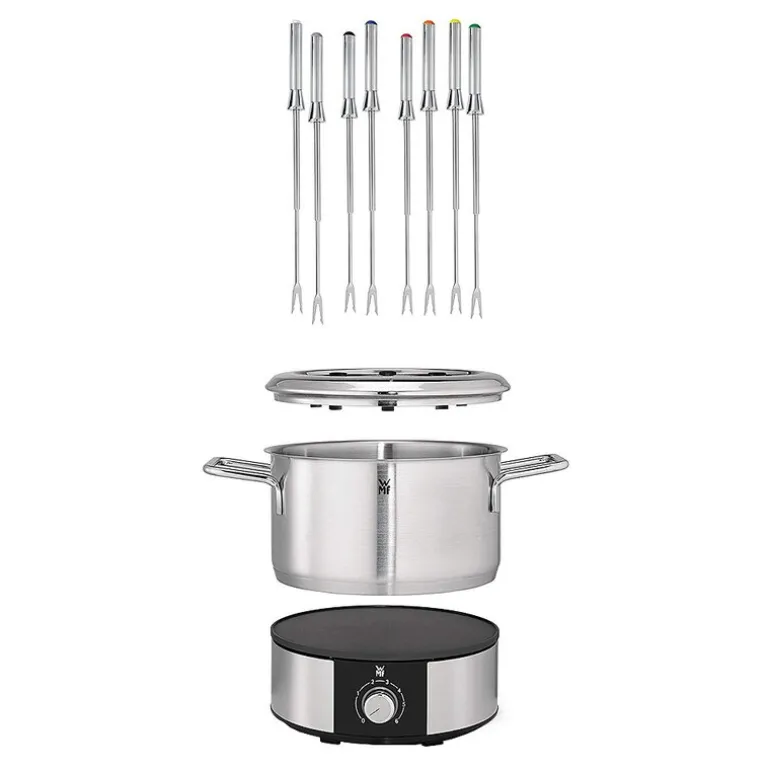 Fonduegaflene har fargemarkeringer og hver sin egen hvileposisjon på kanten av gryten, noe som gjør det enkelt å holde styr på sin egen gaffel uten at de kommer i veien for hverandre. WMF Lono fondue passer til både olje, kjøttbuljong eller grønnsaksbuljong, og gir deg friheten til å variere fondueopplevelsen etter eget ønske.