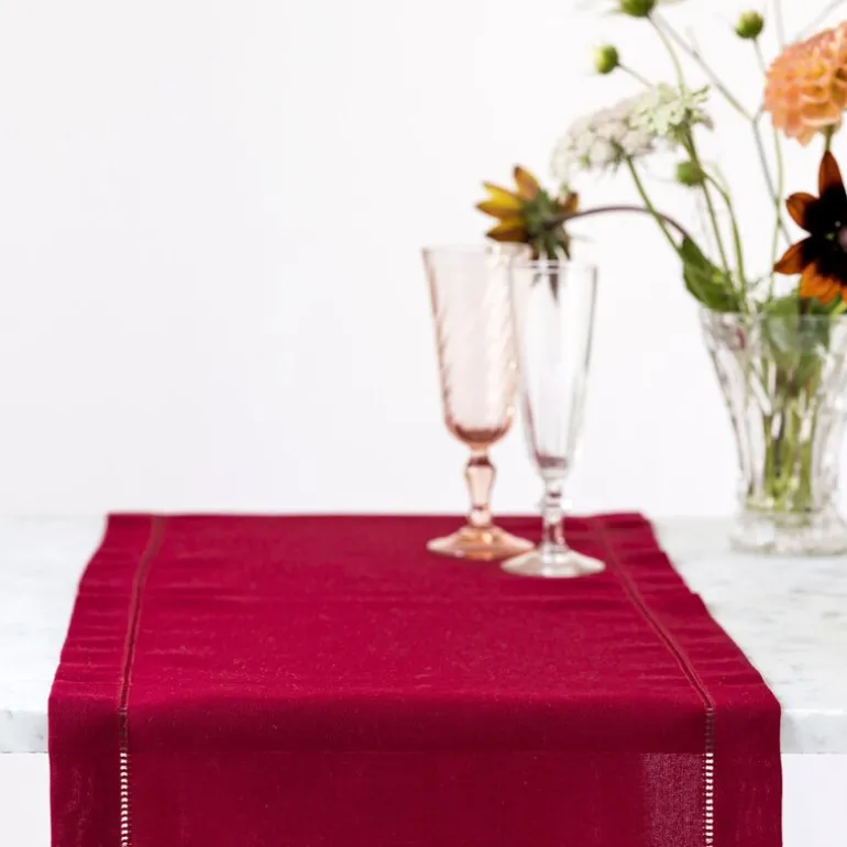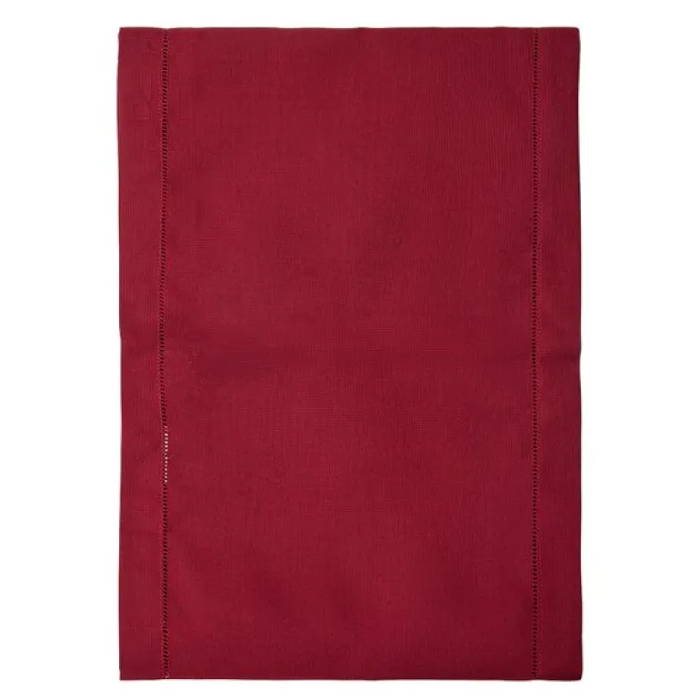 Den klassiske mørkerøde bordløperen med brodert hullsøm er en elegant detalj som løfter enhver borddekking. Laget av flaggduk i høy kvalitet og designet med omhu, balanserer bordløperen tradisjonelt håndverk med moderne estetikk. Med sin dype rødfarge og den delikate hullsømmen langs kanten, tilfører den et sofistikert og tidløst uttrykk til både festlige anledninger og hverdagslige stunder.
