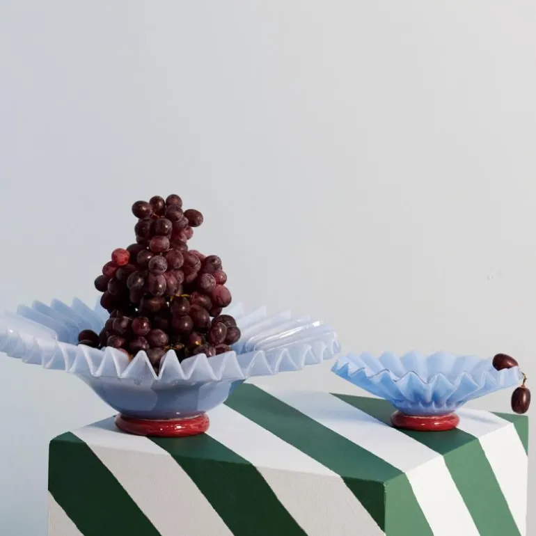 Med inspirasjon fra moteverdenens plisserte skjørt minner formen om en blomst som akkurat er i ferd med å åpne bladene i en vakker lyseblå nyanse. Den runde, lave basen, i glasert bordeaux i kontrast til den plisserte skålen, gjør Lori til en kreasjon du sent vil glemme ved første øyekast. Lori føles som glasskunst, eller som seige karameller i glatt karamellpapir. Uansett hvor Lori flytter inn, gjør den det med samme vekt som eksklusive trofeer. Produktene i Lori-serien er håndlagde, noe som betyr at hver enkelt del er unik og forskjellig. Bruk til telys, smykker, nøtter eller bare som den er. Lori er et kunstverk på bordet og kommer i forskjellige farger og størrelser. Design Byon Studio. Leveres i Byon boks.