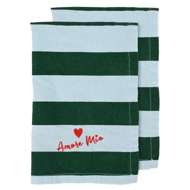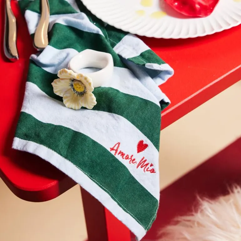 Ekspressive striper er et tilbakevendende tema for Byon. Love-servietten kombinerer et klassisk mønster med en dristig fargekombinasjon av kirsebærrød og smørgul. Napkin Love er brodert med et svart hjerte og teksten «Buon Appetito» som betyr «velsmakende måltid». En oppfordring fra oss om å skape litt ekstra varme og kjærlighet til alle borddekkinger. Matchet med Love eller Leya-familiene for maksimal Byon-følelse. Resultatet er en serviett som setter tonen for hele innstillingen. Laget av sertifisert økologisk bomull. Kommer i en 2-pakning. Mål 45×45 cm. Design Byon Studio. Kommer med vakkert Byon-bånd.