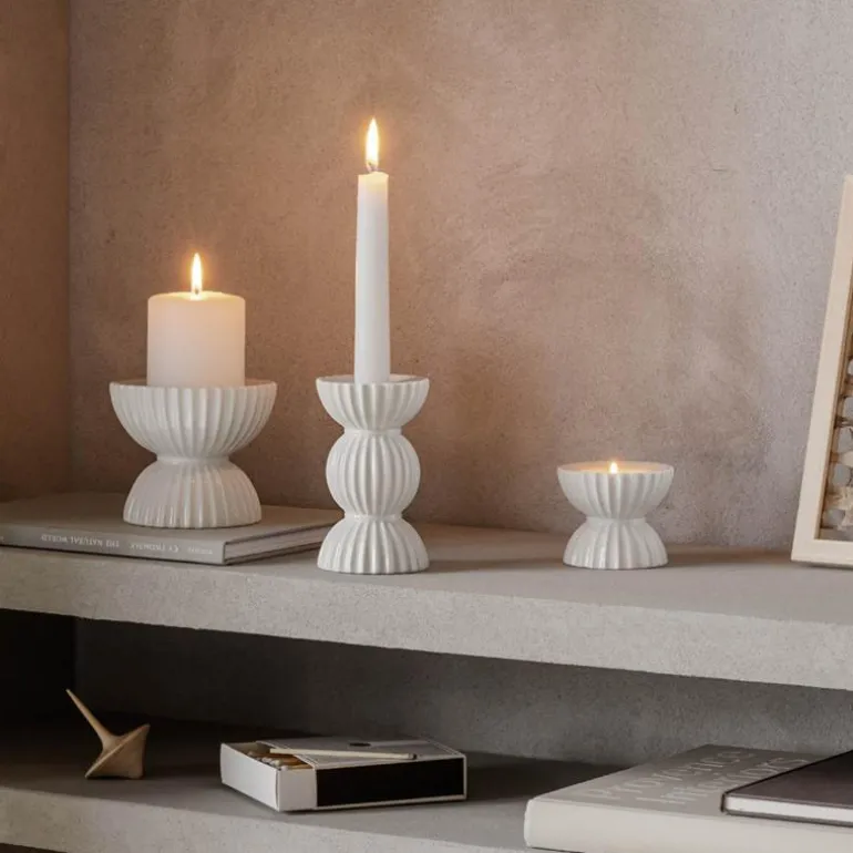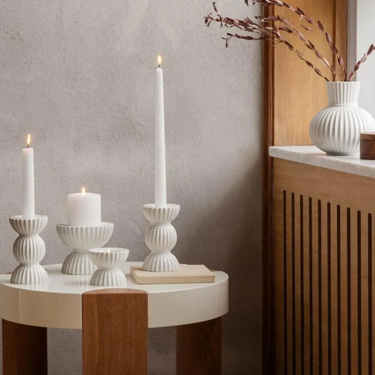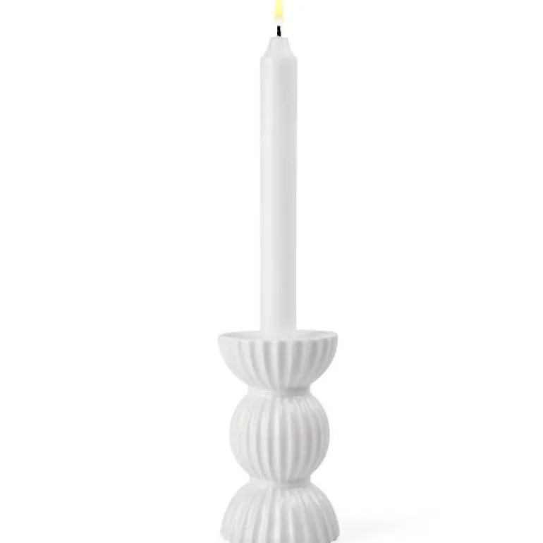 Lyngby Tura lysestake H14 cm hvit. Elegante former, kant og mye attitude. Med denne Tura-lysestaken til koniske lys får du enkel, stilren og dekorativ skulpturell kunst slik vi kjenner den fra Lyngby Porcelæn, der arkivdesign, klassiske former, mønstre og ren estetikk passer perfekt sammen. Lysestaken er 14 cm høy og designet med to smale bånd som løfter lysestaken og gir den et halvkuleformet midtpunkt. De ikoniske rillene fra Lyngby følger lysestakens karakteristiske former og skaper et moderne uttrykk i kontrasten mellom det stramme og det myke. Og detaljen med halvkulene som møtes i et smalt bånd, gir også lysestaken en letthet som passer perfekt inn i et moderne interiør. Med sin voluminøse design og personlighet vil Tura-lysestaken garantert stjele all oppmerksomhet i rommet og er nesten en skulptur i seg selv.