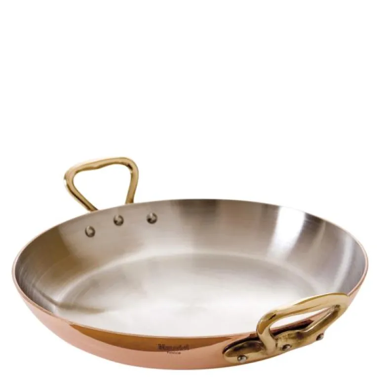 M’150b eggepanne 12×2,5 cm kobber/messing. Mauviel gir profesjonelle og private kokker den beste kulinariske teknologien. Mauviels eksklusive M’150b-serie har et indre belegg av rustfritt stål og flott kobber ytterst. Tykkelse: 1,5 mm – 90 % kobber, 10 % rustfritt stål. M’150b gir deg optimal kontroll over matlagingen, siden kobber har en høy yteevne som varmes opp svært jevnt og mye raskere enn andre metaller; det rustfrie stålets indre bevarer smak og næringskvaliteter i maten og er lett å rengjøre.