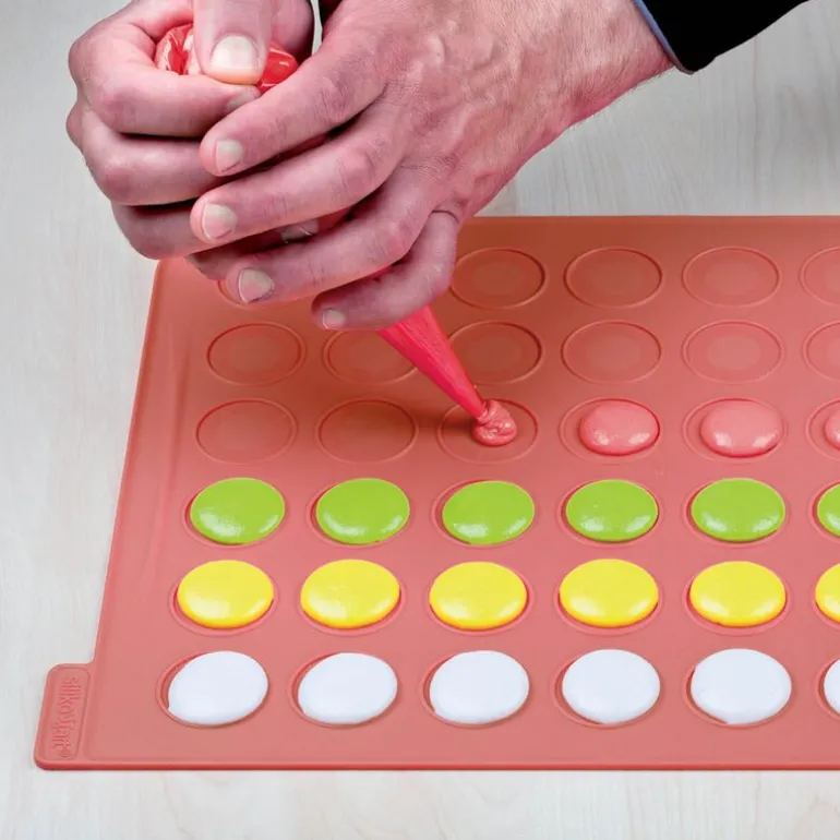 Silikomarts silikonmatte gjør det enkelt å lage perfekte macarons – hver gang. Matten rommer 24 macarons og måler 40 x 30 cm, med ferdig merkede sirkler på Ø 35 mm for nøyaktig størrelse.