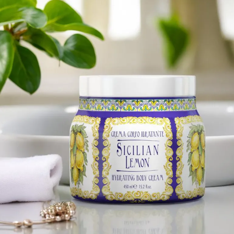 Kroppskrem 450ml – Sicilian Lemon er en luksuriøs Body Cream med mykgjørende og fuktighetsgivende ingredienser som Aloe Vera og Vit E. Med en duft inspirert av Italias planter og frukter.