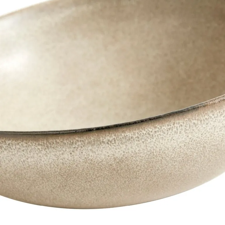 Den reaktive glasuren gir skålen en unik karakter med variert farge og tekstur, og skaper en taktil opplevelse som minner om en sandstrand. Denne glasuren gir hver skål sitt eget særpreg, og små skrapemerker som kan oppstå ved bruk, bidrar til skålens naturlige og autentiske uttrykk.