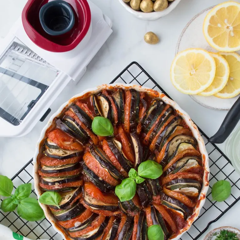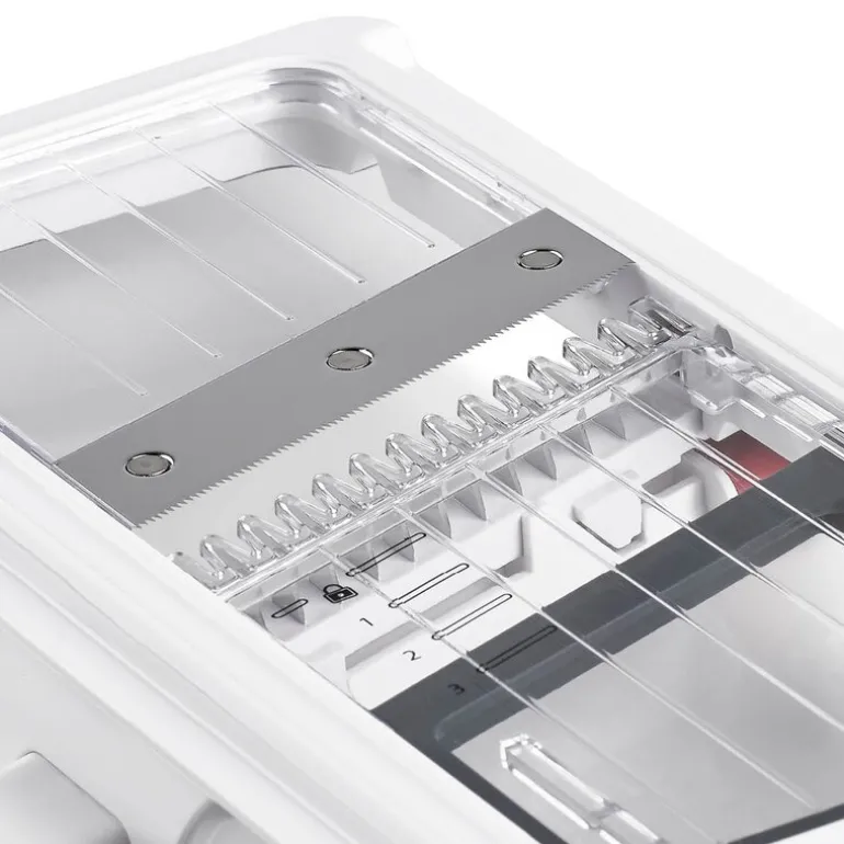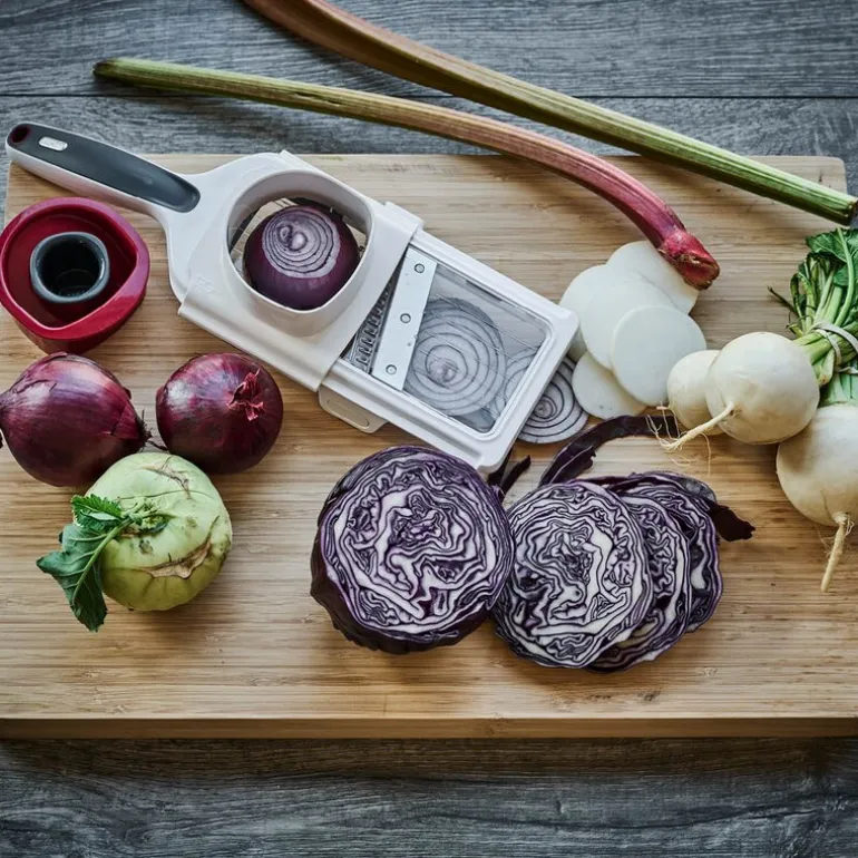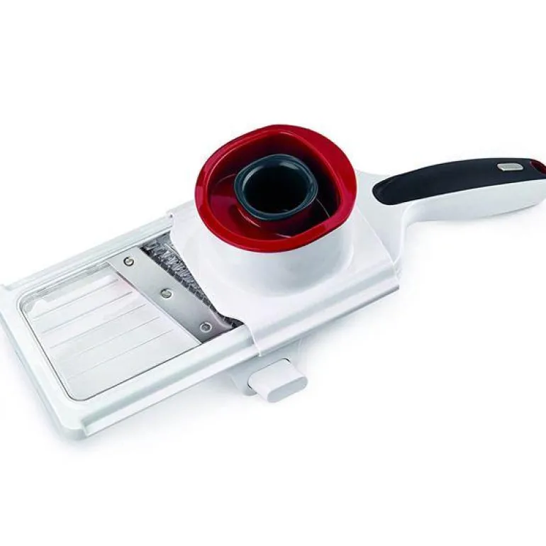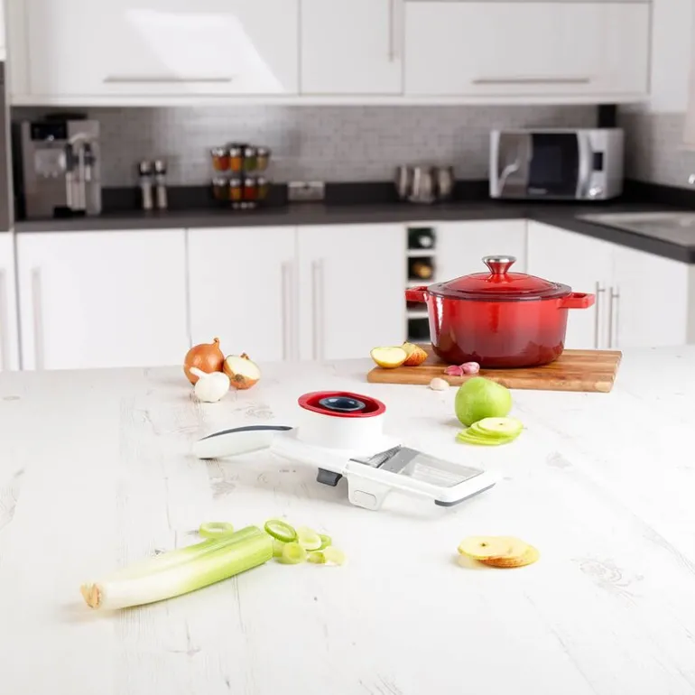 Mandolinen er utstyrt med en smart holder som festes til grønnsaken og beskytter fingrene fra knivbladet, noe som gir trygg bruk. Produktet er 33 cm langt og laget av slitesterk hardplast i hvit, grå og rød farge, med et skarpt knivblad i rustfritt stål for langvarig ytelse. Den kan vaskes i oppvaskmaskin, men håndvask anbefales for å bevare kvaliteten.