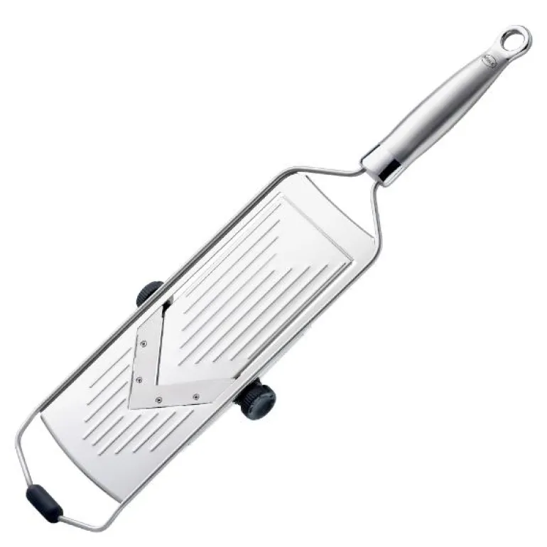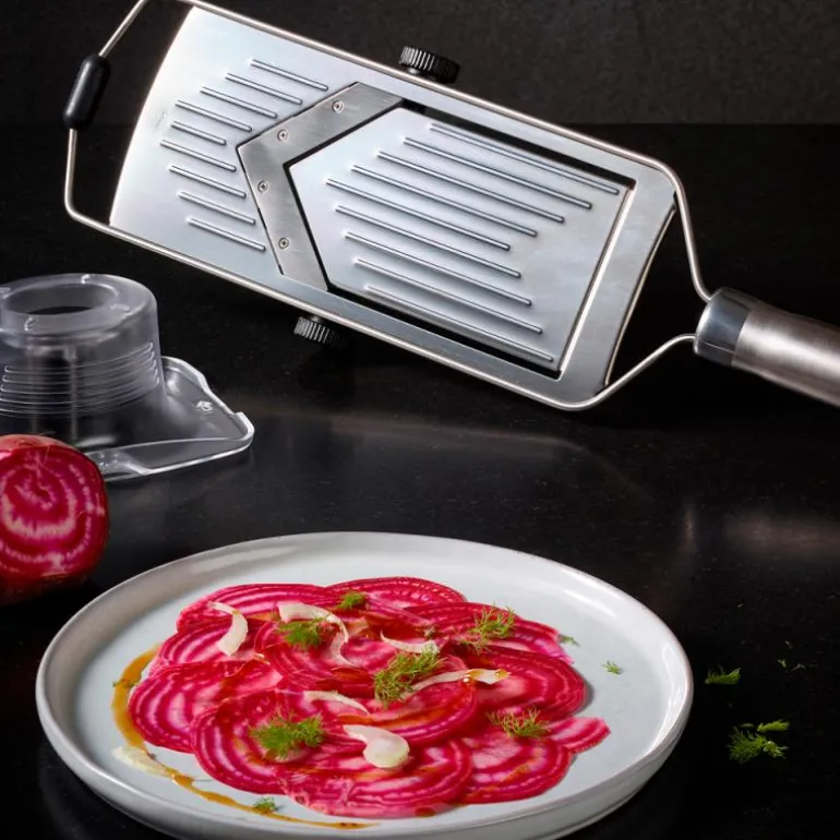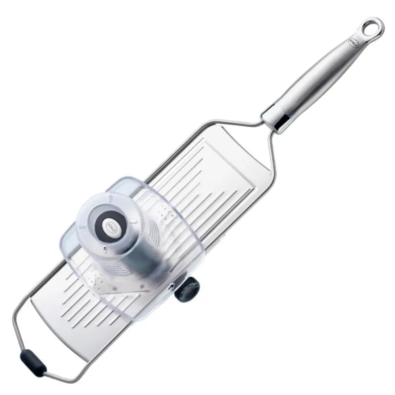RÖSLE mandolinjern har et ekstremt skarpt V-formet skjær som enkelt skjærer selv tomater helt nøyaktig og likt. • Fem forskjellige tykkelser opptil 5 mm• Sklisikker silikon sørger for at mandolinjernet står stabilt, uansett hvilken vinkel du holder det i• Lett å rengjøre ettersom det ikke har noen hjørner der ingrediensene kan samle seg• Solid håndtak som ligger godt i hånden• Inkl. grønnsaksslede• Ikke egnet til oppvaskmaskin• Inkl. beskyttende deksel