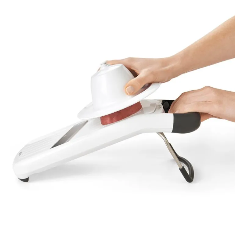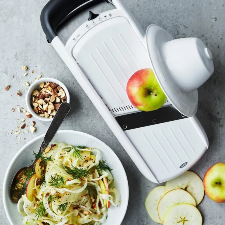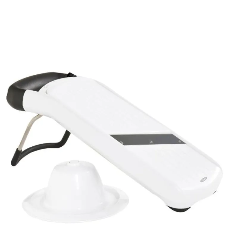 Kompakt og brukervennlig mandolin uten løse deler. Det skarpe, skrå knivbladet i japansk stål skjærer fine skiver av alt fra harde poteter til bløte tomater. Mandolinen har tre innstillinger for tykkelse, og det lager selvfølgelig også juliennestrimler. Holderen har en smart fjærfunksjon som sørger for at maten du skjærer automatisk skubbes frem til knivbladet. Kan vaskes i oppvaskmaskinens øverste kurv.