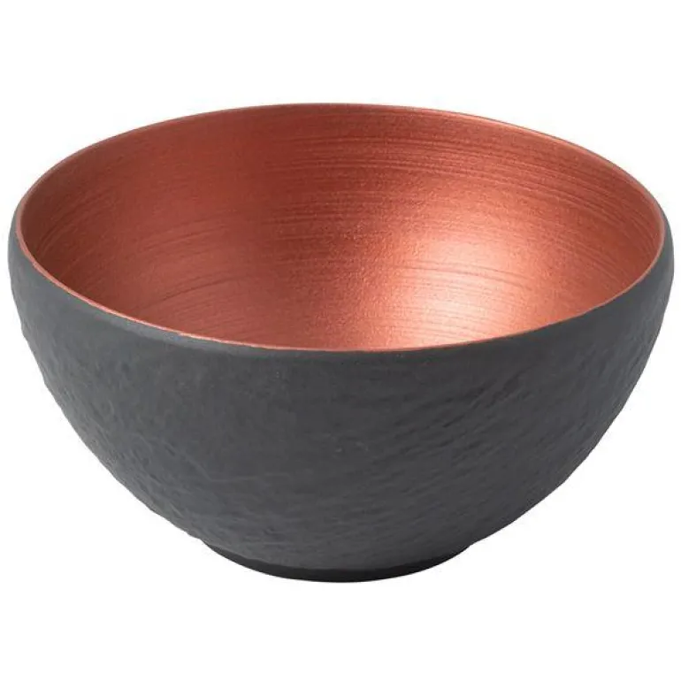 Skålen fra Villeroy & Boch er laget av sort porselen med en håndmalt kobberfarge på innsiden. Skålen har en matt og rå struktur på utsiden.