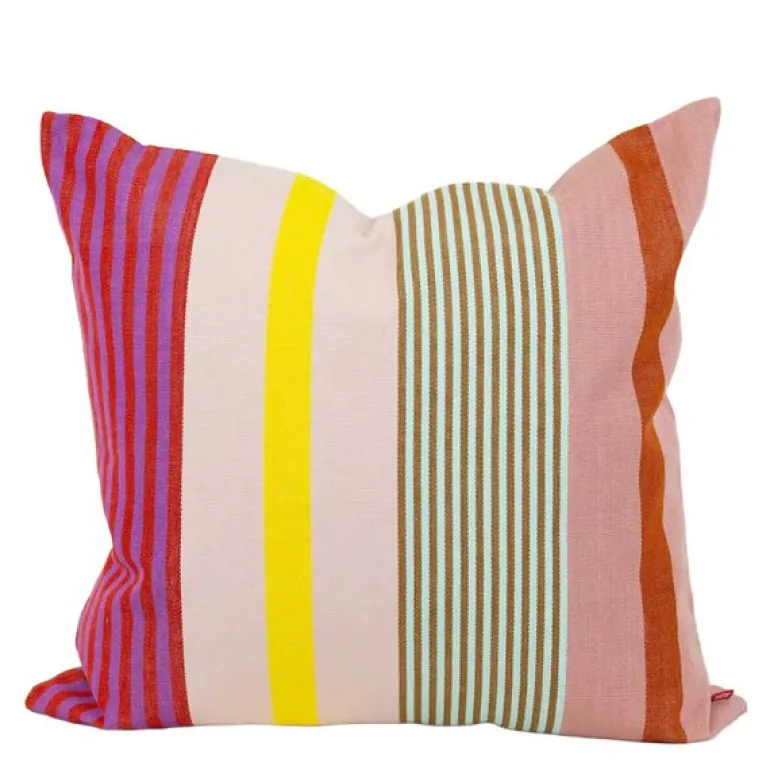 Margarita putetrekk 50×50 cm fra A World of Craft er håndvevd i kraftig ripskvalitet, med fargerike striper og et uttrykk som kombinerer nordisk enkelhet med tradisjonelt mayahåndverk. Hver pute er et resultat av bevisst produksjon og stolte håndverkstradisjoner.